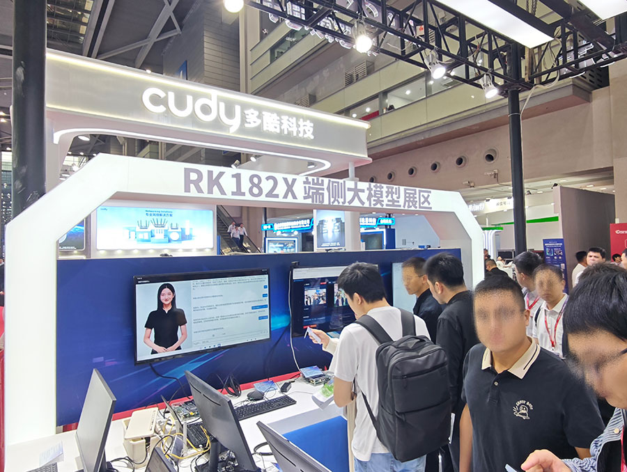 端側(cè)大模型展區(qū),展出RK182X端側(cè)AI算力協(xié)處理器及系列相關(guān)應(yīng)用。RK182X具備大算力、高帶寬特性,支持3B/7B大模型突破百token/s輸出,可根據(jù)算力需求疊加一個(gè)或多個(gè)RK182X協(xié)處理器,為終端設(shè)備提供前所未有的算力靈活性,針對(duì)端側(cè)AI復(fù)雜計(jì)算需求,特別是在多路視覺分析領(lǐng)域如智能安防、智能社區(qū)、智能校園等提供安全、可靠、低成本的AI部署選擇。