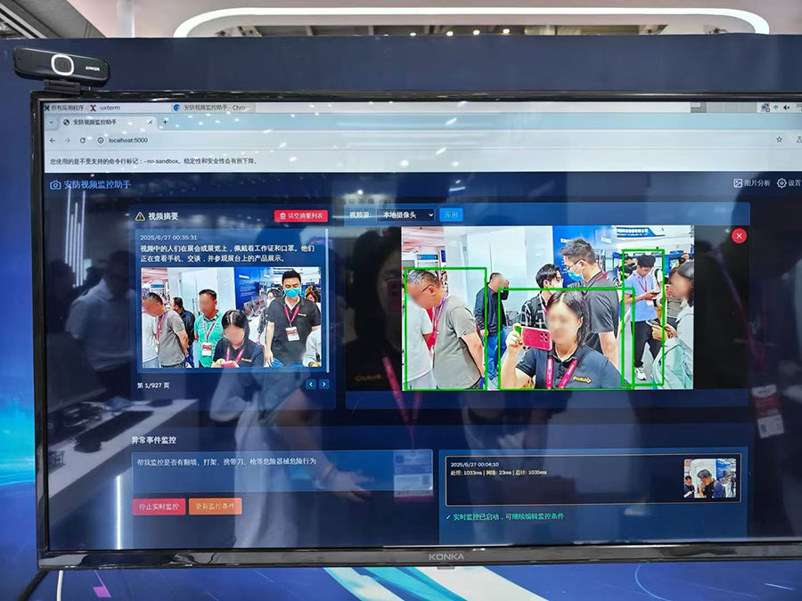 RK3588負(fù)責(zé)視頻場(chǎng)景切片,RK182X負(fù)責(zé)加速多模態(tài)模型推理,實(shí)現(xiàn)接近實(shí)時(shí)的處理性能。該方案可應(yīng)用于多種場(chǎng)景,例如針對(duì)多路攝像頭長(zhǎng)時(shí)間監(jiān)控的場(chǎng)景,可自動(dòng)監(jiān)看現(xiàn)場(chǎng)視頻,生成簡(jiǎn)潔的視頻文字摘要。同時(shí)支持任意定制的萬能異常事件布控。