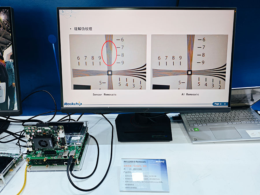 作為本次的重磅新品,瑞芯微新一代4K機(jī)器視覺芯片RV1126B備受關(guān)注。RV1126B具備3T強(qiáng)勁算力,可運(yùn)行2B以內(nèi)規(guī)模的大語言模型及多模態(tài)模型,針對(duì)算力、AI-ISP、AOV3.0、超級(jí)編碼、防抖等性能均有明顯升級(jí)?,F(xiàn)場(chǎng)演示了多項(xiàng)引領(lǐng)行業(yè)的技術(shù)應(yīng)用,賦能各類視覺設(shè)備實(shí)現(xiàn)從“看得見”到“看得懂”的質(zhì)的飛躍: